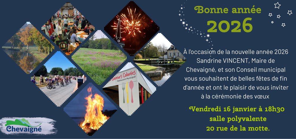 Sandrine VINCENT, Maire de Chevaigné, et son Conseil municipal ont le plaisir de vous inviter à la cérémonie des vœux le vendredi 16 janvier 2026 à 18 h 30, salle polyvalente, 20 rue de la motte